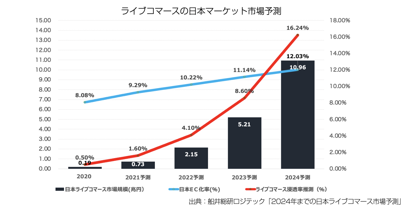 まだ中国ほどの市場規模はありませんが、日本のライブコマース市場も伸びてきています。コロナ禍の長期化によるEC市場の伸びやライブ配信自体の人気の高まりなどの様々な要因から日本でもライブコマースの認知や人気が高まっています。
